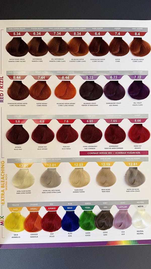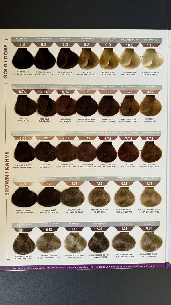 • ۶.۷۴، ۷.۷۴، ۸.۷۴: قهوه‌ای یا بلوند با ته‌رنگ طلایی-مس در درجات مختلف