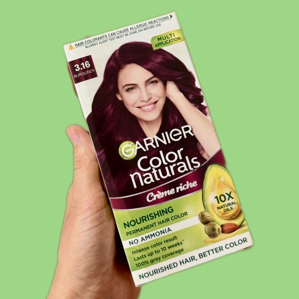 رنگ موی نمایش داده شده در تصویر، بورگاندی (Burgundy) با شماره 3.16 از سری Garnier Color Naturals Crème Riche است.
