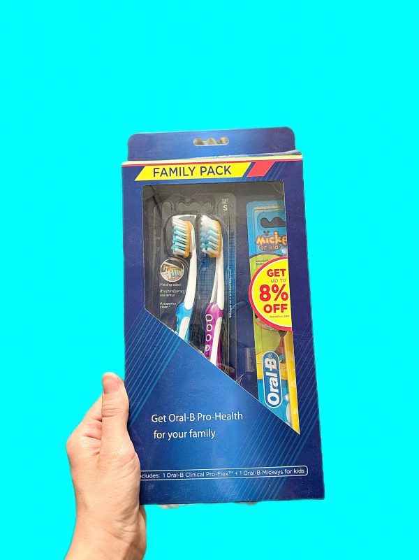 پکیج خانواده مسواک های اورال بی شامل یک بستهی دو عددی مسواک اورال-بی سری Clinical Pro-Flex و یک عدد مسواک اورال-بی سری Mickeys برای کودکان است که در مجموع بسته ای سه عددی را میسازد.